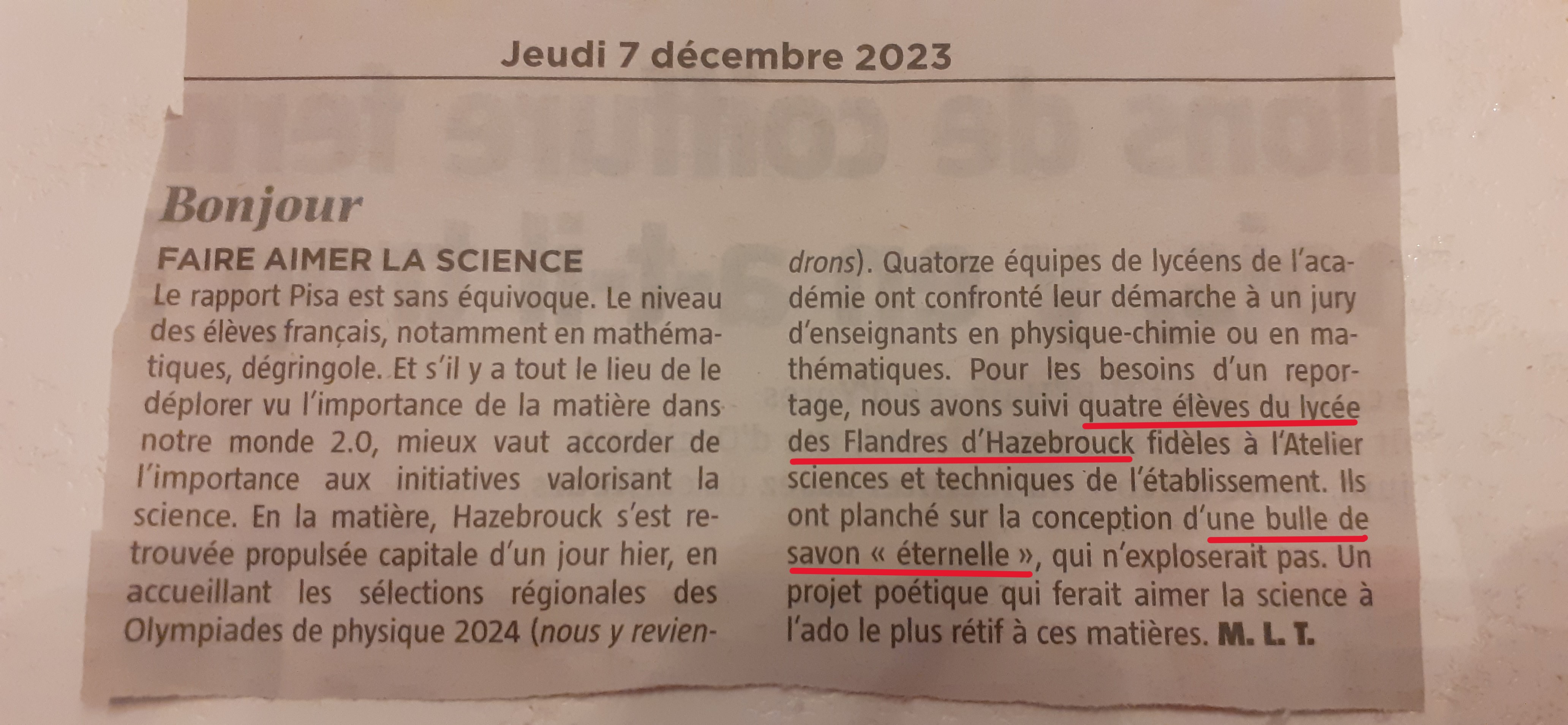 Leur thèse est la suivante: "Comment faire tenir une bulle le plus longtemps possible?" supervisée par leur professeur de physique, Mr Dumont ainsi que la préparatrice de laboratoire Alexandra Morel depuis mars 2023. Depuis ce jour, ils ne s'arrêtent plus. Qui sont-ils?